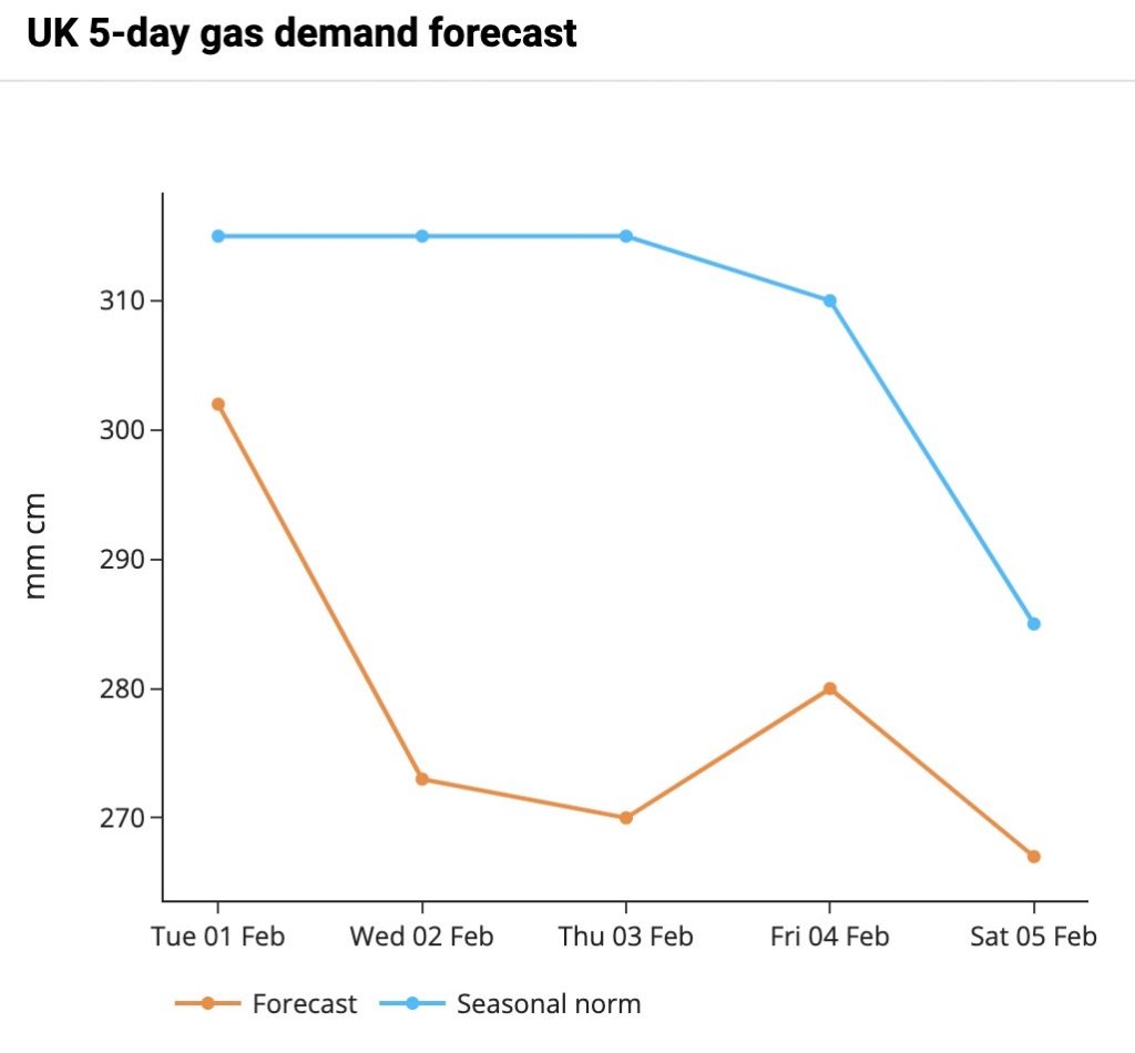 In the UK, gas demand is expected to drop by 14% below seasonal norms on Wednesday and Thursday according to National Grid (see chart).