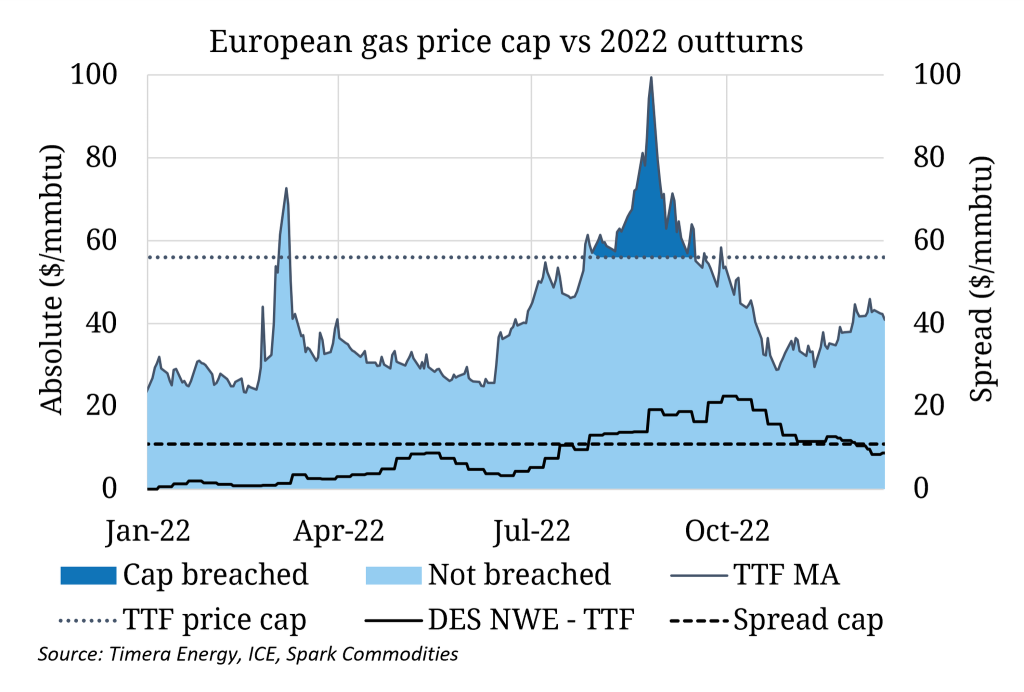 In 2022, the cap would have been triggered from early August to mid-September. By bringing in the cap, the EU is trying to artificially bring the price of demand destruction in Europe lower, whilst retaining its ability to compete with Asia for LNG.