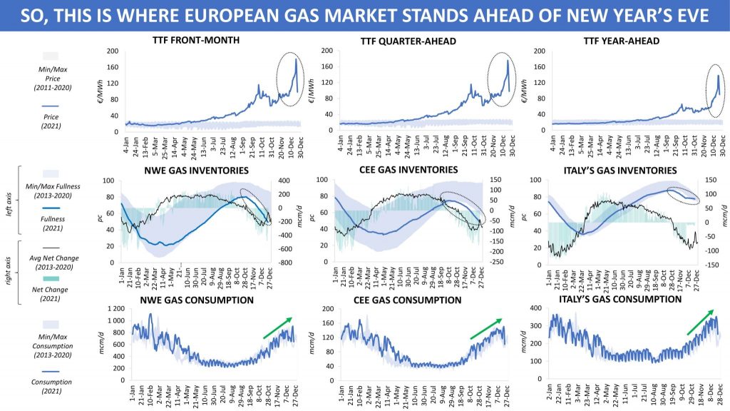 Only time will tell whether the beginning of 2022 can bring some peace to the European gas market, but for now there is little evidence that the current turbulence should die away. Gas heating consumption has not peaked yet, and with colder weather in January and February demand for additional volumes will likely see renewed vigour. At the same time, the competition for LNG would probably be intensifying on the global market as even short-lived cold snaps in China, Japan or South Korea will make Asian importers actively join in the race for spot cargoes. That does not even include the spread of the Omicron variant across Europe and rising geopolitical tensions on the continent.