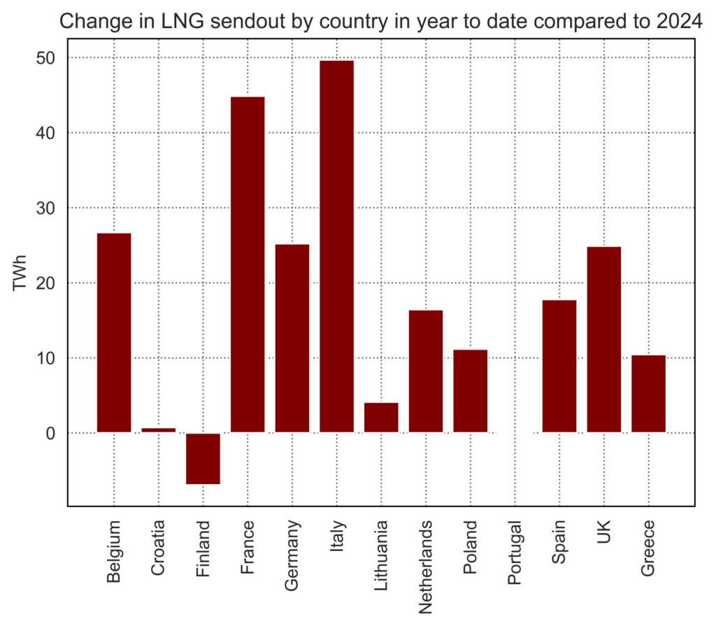Among major European markets, Italy currently has the largest volume of gas in storage as a % of total capacity, having crossed 75% last week. This has been enabled by to the fact that Italy has been, in the year to date, the largest source of incremental LNG imports to the continent (see the chart below), as Italian LNG imports have continued to rise since January, hitting record month after record month.