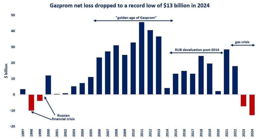 Gazprom recorded a second year of heavy losses in 2024, the worst in the company’s history, with a net loss of near $13 billion.