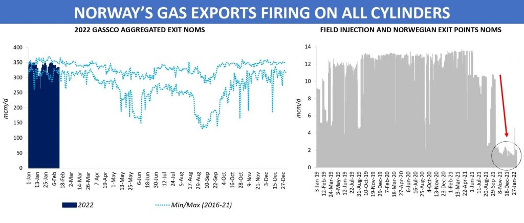 Unless there are unscheduled outages on the production fields, Norwegian gas exports should remain elevated up to the end of April when the first batch of 2022 annual maintenance is planned at the country’s assets.