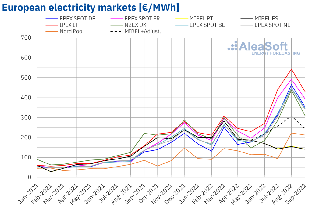 In the third quarter of 2022, prices of all analysed European electricity markets increased. The high gas and CO2 emission rights prices caused the quarterly averages to exceed €345/MWh in almost all European electricity markets. These prices are the highest registered so far in the European electricity markets. Source: Aleasoft