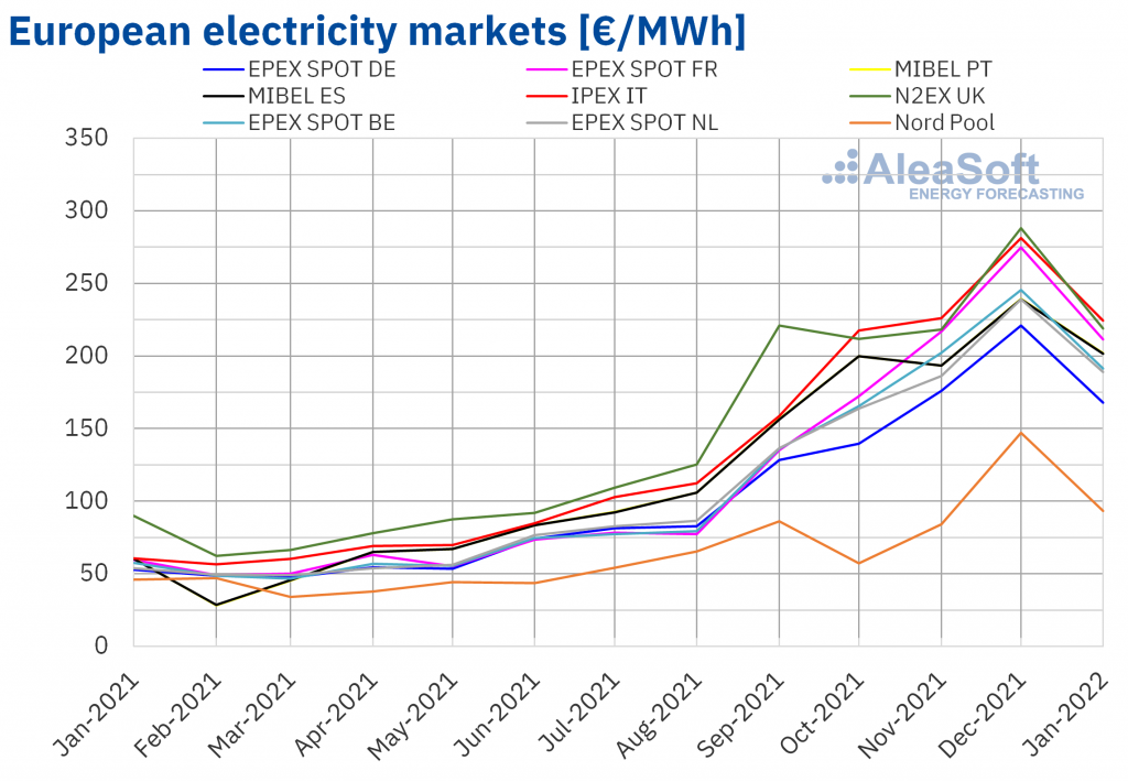 In January, the average price of the European electricity markets exceeded €165/MWh in most cases. These prices were lower than those of December but still much higher than those of January 2021