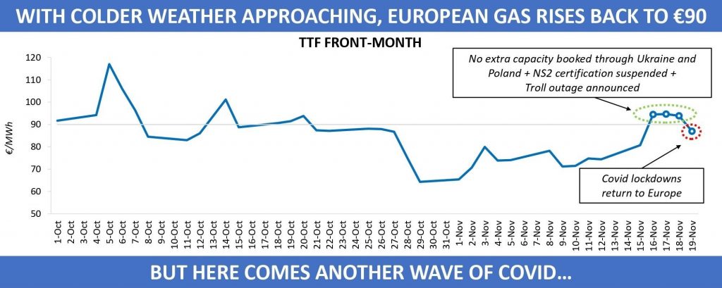 Winter contracts held firm above the €90/MWh mark for three consecutive days until 19 November, when COVID-19, forgotten by many amid widespread vaccination, was back on the radar. Contracts for delivery between December 2021 and February 2022 weakened to around €87/MWh on Friday on a record surge in the number of coronavirus infections. On 19 November, Austria became the first country in Western Europe to announce a full lockdown starting on Monday, only a few days after bringing restrictions for the unvaccinated. Germany also does not rule a national lockdown, with other European countries reintroducing partial lockdowns.