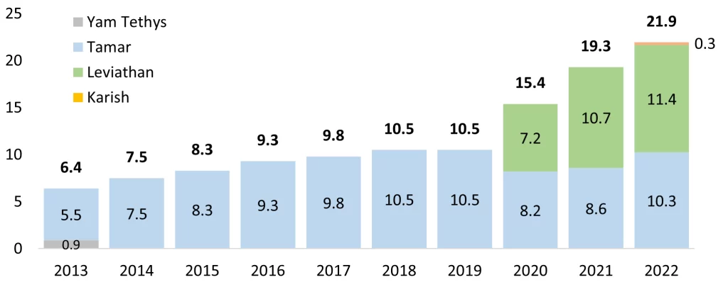 Israeli gas production in the past 10 years (2013-2022), bcm