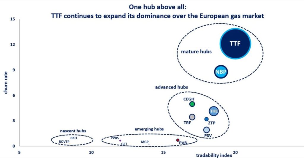 Traded volumes on TTF rose by around twenty times between 2012-22 and overpassed NBP in 2014 to become Europe’s largest gas hub.