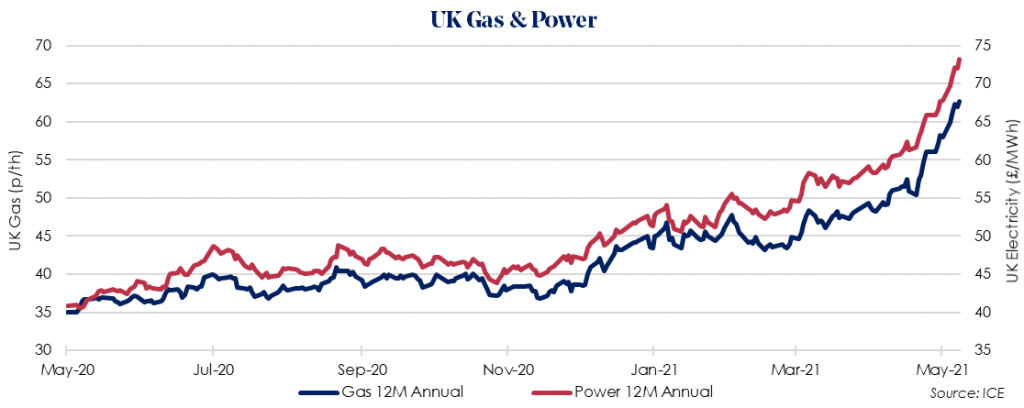 The Oct 2021 12 Month Power price rose by 7.9% to £73.20/MWh. Increases in the price of power are expected, with easing Covid-19 lockdown measures spurring demand. The current magnitude of the price increases remains driven by the record-breaking cost of EU carbon.