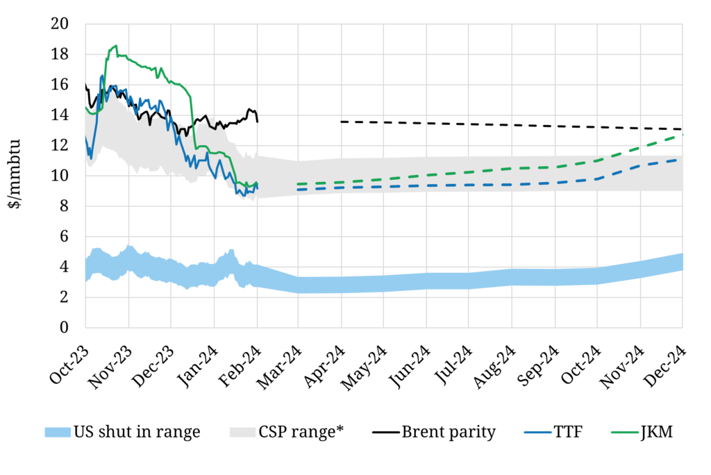 2. Recent forward curves, coal switching price (CSP) range & US LNG ‘shut in’ range