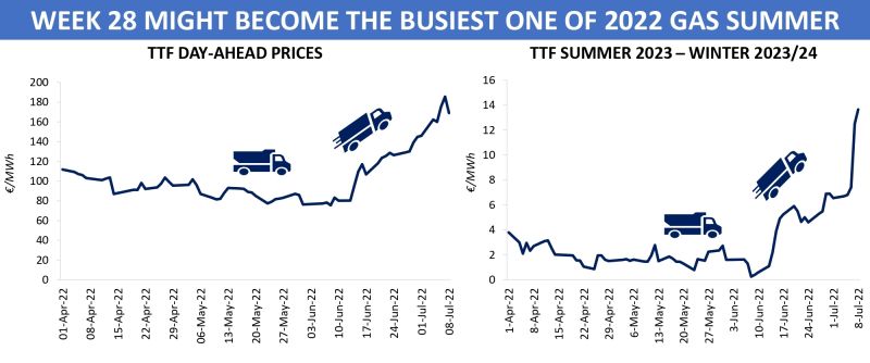 Last week, prompt contracts on the European gas hubs got even closer to record highs registered in March 2022. Bearing in mind supply/demand fundamentals that come into play in week 28, few people would be surprised to see the region’s market going through another period of high price volatility.