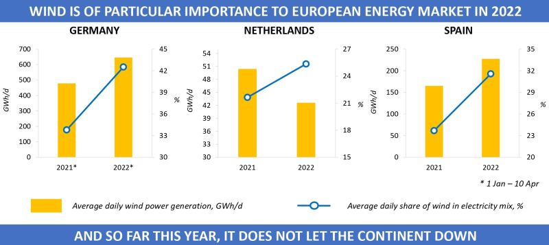 Both NWE and South Europe have seen higher wind’s contribution to their electricity mix between 1 January and 10 April 2022 as compared with the same period in 2021. The share of wind energy in power demand increased year-on-year in the Netherlands, France, Spain, Italy, and the list is longer.