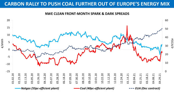 One can hardly overestimate the importance of rising carbon allowances, with the indicative front-month baseload spread for a medium-efficiency NWE gas-fired plant being €0.7/MWh between 1 Apr and 7 May ’21 while that for a 40pc coal unit stood at minus €5.5/MWh.