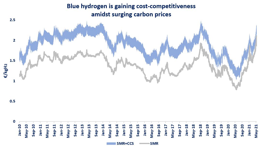 The surge in European carbon, hovering between €50-55/tCO2eq is having profound implications across energy markets and technologies, hydrogen is certainly one of them.