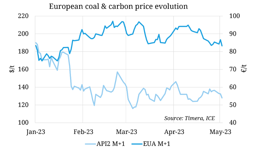 As we laid out in our feature article on Monday, European gas to coal switching economics are back in focus as the key anchor for Summer 2023 gas prices, and potentially a floor for Winter 2023 gas prices. In this snapshot we therefore turn to a quick update on European coal & carbon prices, the key ingredients of switching channel economics.