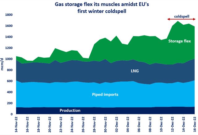 The flex monster is back: EU gas storage provided almost all incremental gas supply during last week’s coldspell, demonstrating once again its crucial role for the European gas and energy system.