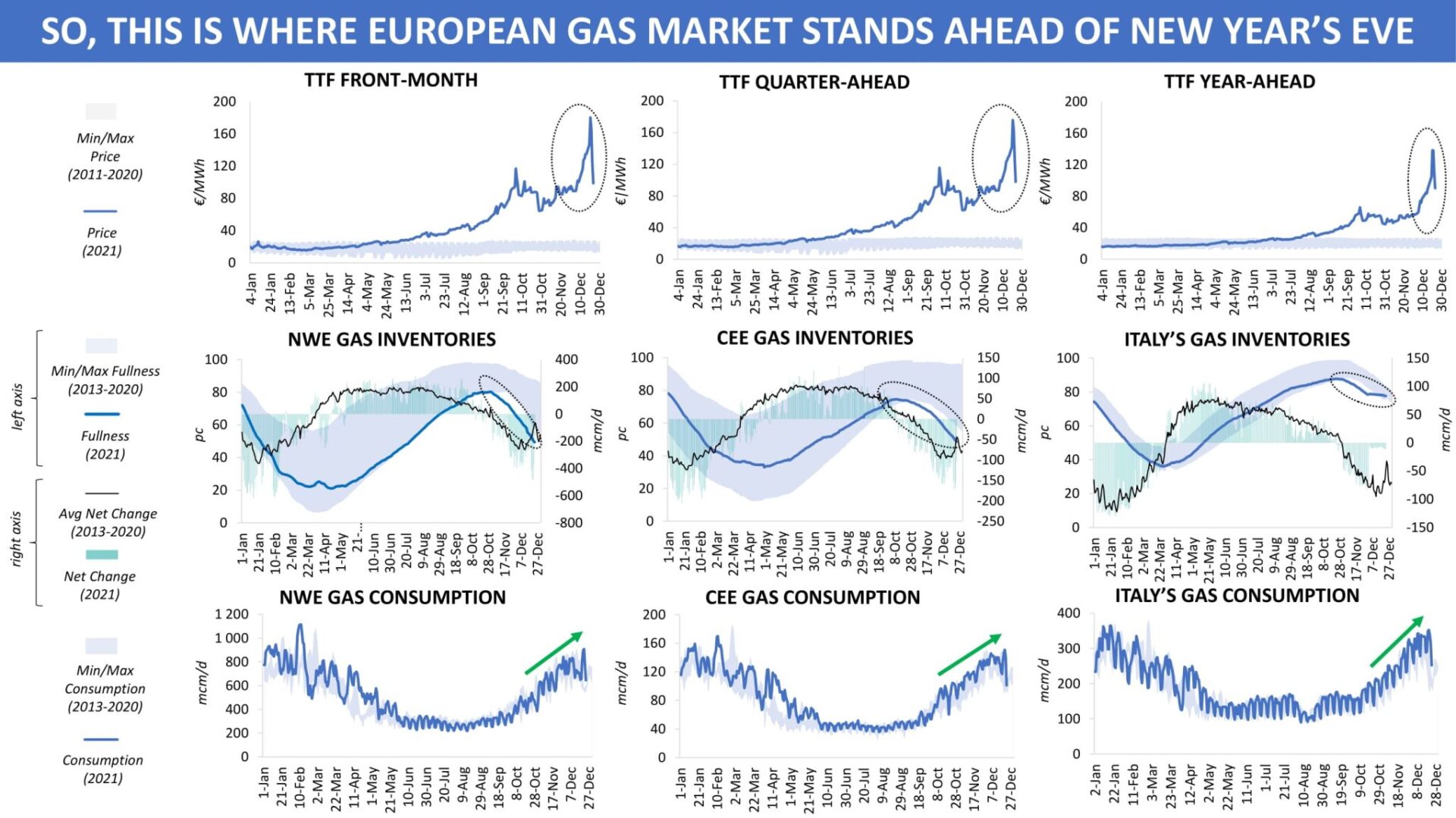 Only time will tell whether the beginning of 2022 can bring some peace to the European gas market, but for now there is little evidence that the current turbulence should die away. Gas heating consumption has not peaked yet, and with colder weather in January and February demand for additional volumes will likely see renewed vigour. At the same time, the competition for LNG would probably be intensifying on the global market as even short-lived cold snaps in China, Japan or South Korea will make Asian importers actively join in the race for spot cargoes. That does not even include the spread of the Omicron variant across Europe and rising geopolitical tensions on the continent.