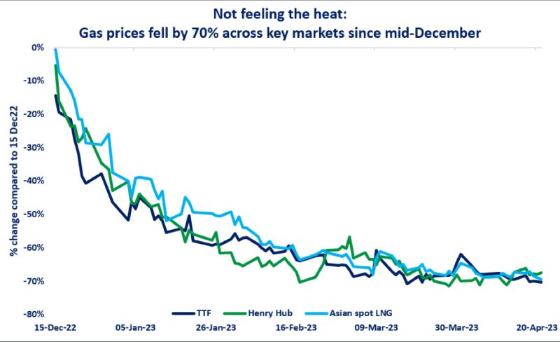 Gas prices dropped by close to 70% since mid-December across all key gas markets amidst easing supply-demand fundamentals and high storage levels.