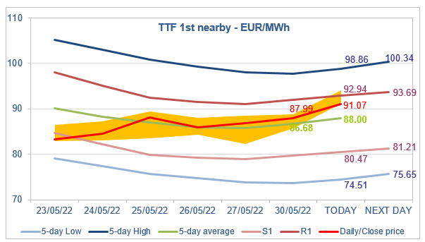 For their last day of trading, TTF ICE June 2022 prices closed above the 5-day average yesterday, confirming the (slight) uptrend. This morning, July 2022 prices continue this bullish trend.