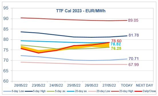 With the drop in Norwegian flows, TTF ICE June 2022 prices have interrupted their downtrend, finding an equilibrium around their 5-day average. On their side, supported by the resilience in coal prices, TTF Cal 2023 prices were more bullish. The 20-day average could set a resistance, but a rise to the 5-day High cannot be excluded.