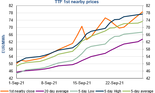 At the close, NBP ICE October 2021 prices increased by 5.000 p/th day-on-day (+2.63%), to 195.380 p/th. TTF ICE October 2021 prices were up by €2.06 (+2.69%) at the close, to €78.565/MWh. On the far curve, TTF Cal 2022 prices were up by 47 euro cents (+0.98%), closing at €48.846/MWh, widening the spread against the coal parity price (€38.857/MWh, -2.53%).