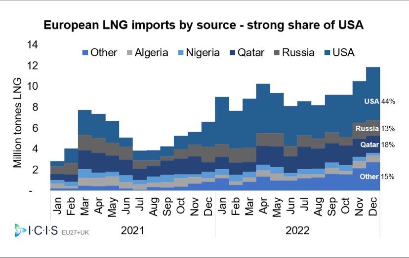LNG imports to Europe rise to over 111 Million tonnes (~154 bcm natural gas) in 2022, up from 64Mt (~88 bcm) in 2021 according to data from ICIS, writes Andreas Schroeder
