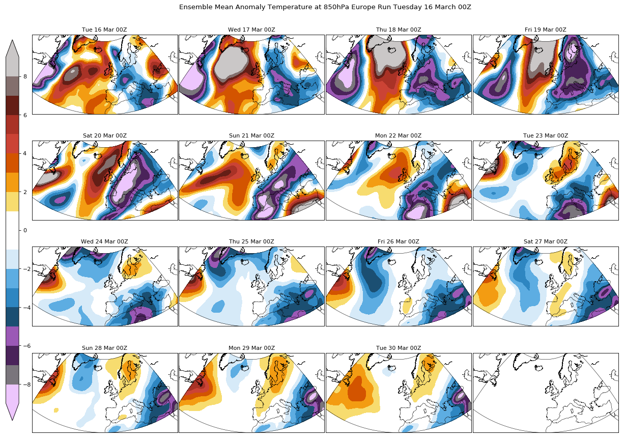 The coldest day will be Saturday 20th, with an anomaly reaching -8 to -10 degrees below normal in France and Germany.