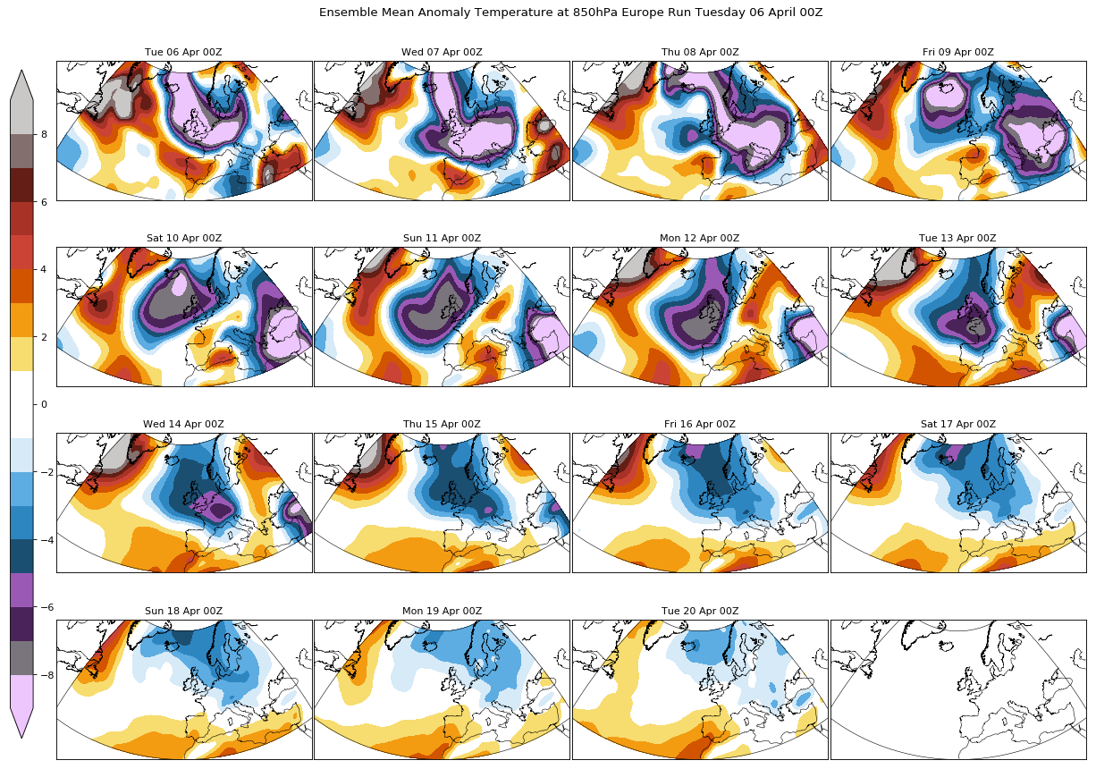 Week 15 – The week starts with a new drop in temperatures almost everywhere, as a high pressure starts to build in the north Atlantic, favouring a northerly flow once again. The anomalies will be more remarkable over the most westerly areas, like the UK or France, a bit more moderate over Germany and other Central Europe areas.