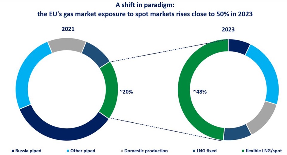 The EU’s gas market exposure to the global spot market is set to rise drastically in the coming years from less than 20% to over 50%.