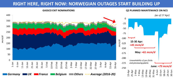 Europe has already begun to experience lower production from the NCS. Norwegian maintenance, that has started during the second ten days of Apr, represents the first significant decline in gas supplies to NWE since Jan.