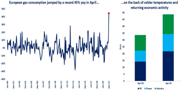 The great recovery: European gas demand jumped by a staggering 45% in April, its steepest yoy increase on record.