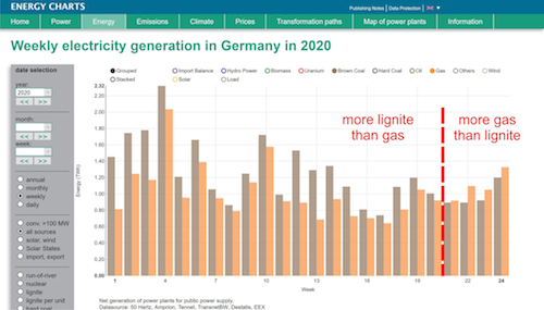 In Germany, for the past four weeks, public net electricity generation from gas has been higher than from lignite. This has never happened before, not even in one week.