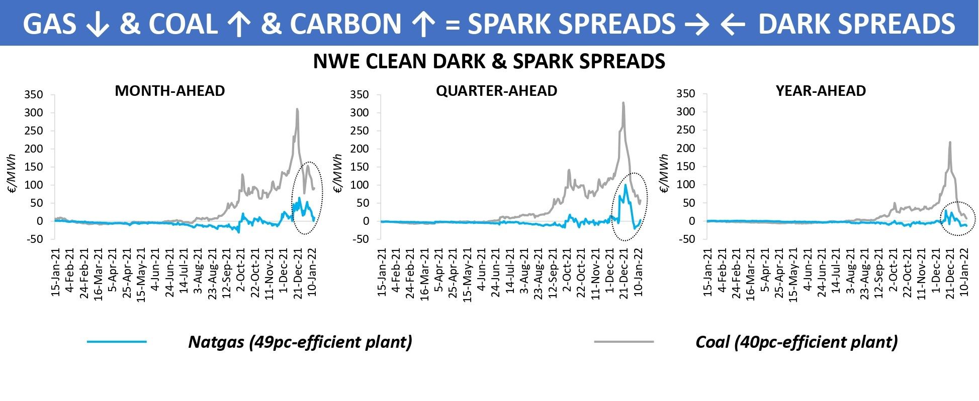 As a result, the indicative NWE front-month baseload spread for a 40pc coal-fired plant averaged €65/MWh in Q3 and Q4 2021, with that for a 49pc-efficient CCGT being at minus €3.5/MWh. At its peak in mid-December, when gas prices reached a new record high across Europe, the difference between dark and spark spreads exceeded €200/MWh.