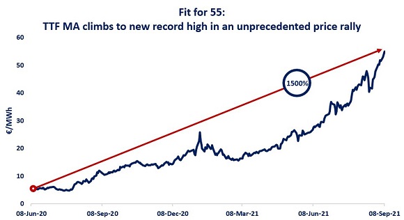 Fit for 55: TTF MA breached today the €55 mark, rising by ~1500% increase since its record lows last year May in an unprecedented price rally in the history of European gas.