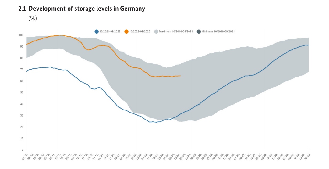 German natural gas consumption in the week beginning 9 April 2023 was 13.7% below the average consumption for 2018 to 2021. Wholesale prices have fallen in the last few weeks.