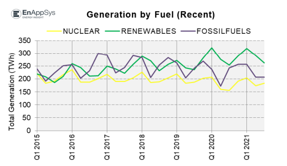 In Q3, 2021, coal/lignite-fired generation contributed a greater share of generation than gas-fired generation, reversing the trend in recent years in which the share of coal/lignite had been declining.