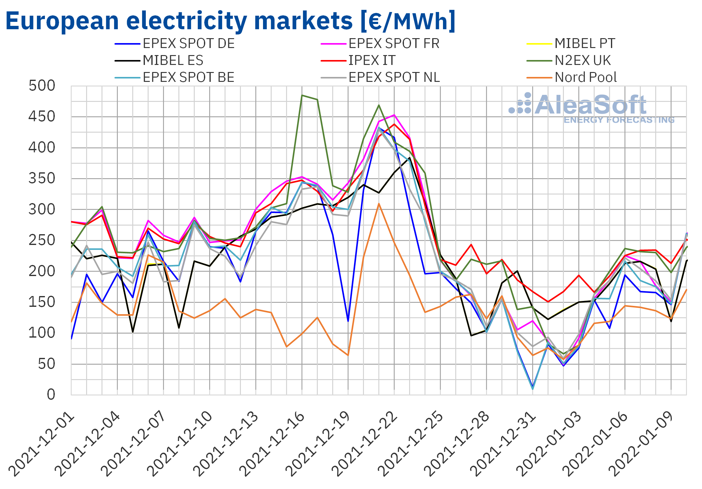 In the first week of January, European electricity markets prices increased compared to the previous week and in most cases the average exceeded €150/MWh, despite the fact that negative hourly prices were registered in some markets at the beginning of the week.