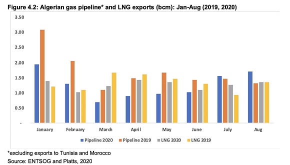 Over the last ten years, Algeria’s natural gas exports have stagnated or declined. The fierce competition among existing and new gas exporters for a share of a depressed European gas market combined with very low spot market prices have further weakened the competitiveness of Algeria’s oil price-linked gas exports. Source: OIES