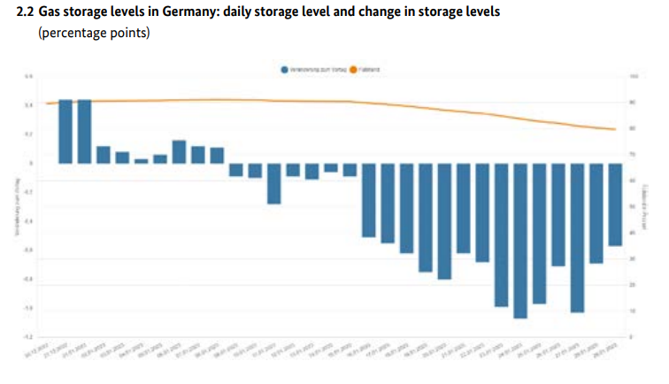 Gas is mainly being taken out of storage. The total storage level in Germany is 79.82%. The storage level at the Rehden facility is 90.29%.