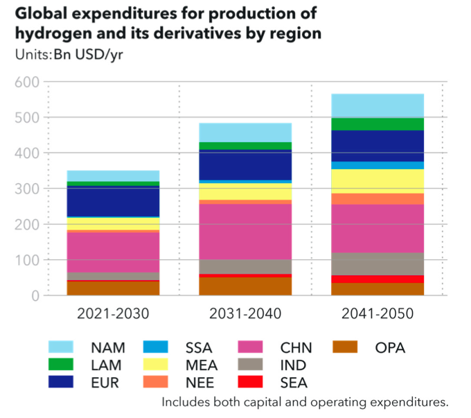 Global spend on producing hydrogen for energy purposes from now until 2050 will be USD 6.8trn, with an additional USD 180bn spent on hydrogen pipelines and USD 530bn on building and operating ammonia terminals.