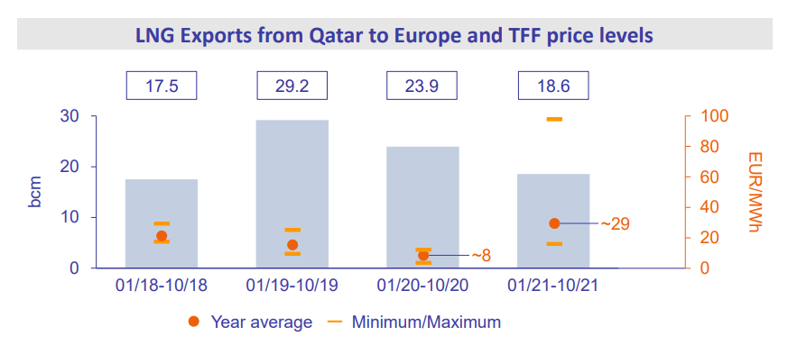 While deliveries of U.S. LNG were on par with deliveries in 2020, shipments from Qatar, traditionally one of the top suppliers to Europe, lagged behind those of previous years until October 2021.