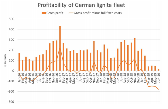 Are Germany’s lignite plants now worthless? According to the report authors, the gross profit of the German lignite fleet collapsed by 54% in the first half of 2019. Author: Dave Jones