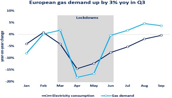 (Greg Molnar) The road to recovery? European gas demand was up 3% yoy in Q3, and electricity consumption climbed back to last year’s levels in September for the first time since the covid outbreak.