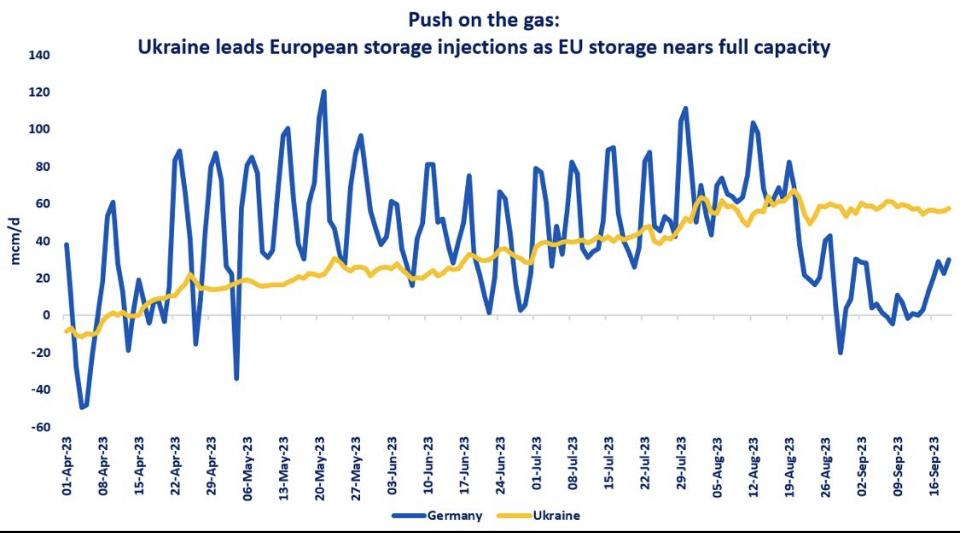 Ukraine’s storage injections were outpacing Germany since mid-August and these days account for around 30% of total EU+Ukraine injections.